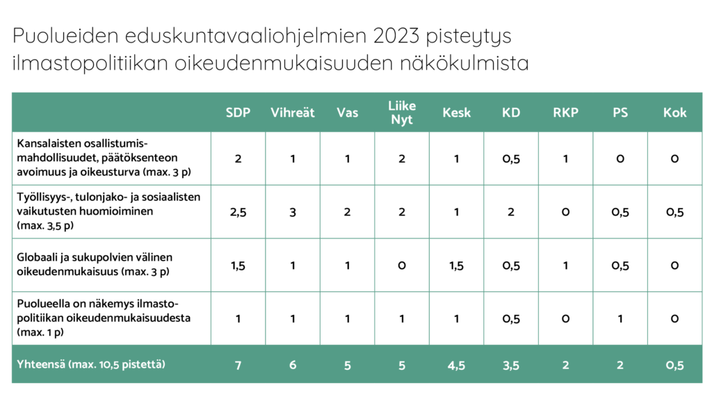 Lähes kaikki puolueet huomioivat vaaliohjelmissaan ilmastopolitiikalla olevan ainakin jonkinlaisia sosioekonomisia vaikutuksia. Näkökulmat jäivät kuitenkin melko yksipuolisiksi. Kokoomus ja perussuomalaiset nostivat esiin lähinnä ilmastotoimien vaikutukset ihmisten elinkustannuksiin, mutta eivät erikseen huomioineet, että vaikutukset voivat kohdistua ihmisiin epätasa-arvoisesti. Myös vasemmistoliitolla ja SDP:llä ilmastopolitiikan vaikutusten tarkastelu keskittyi yllättävän yksipuolisesti lähinnä tulonjakoon liittyviin vaikutuksiin.